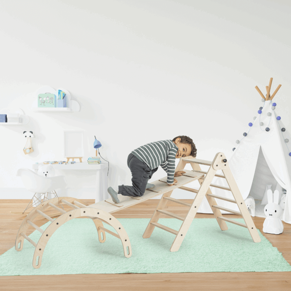 - Casitas, toboganes y piezas Montessori que invitan a la exploración autónoma.