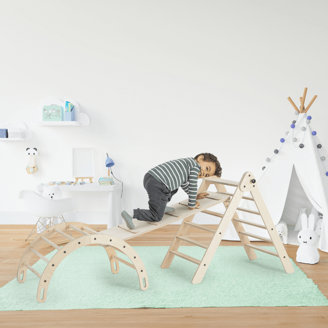 - Casitas, toboganes y piezas Montessori que invitan a la exploración autónoma.
