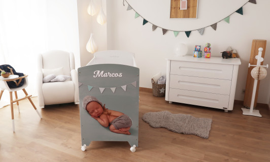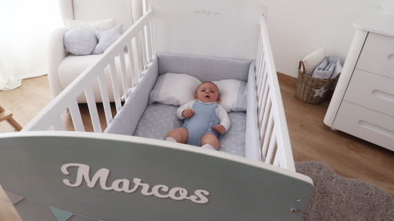 Se les ocurrió la maravillosa idea de utilizar una foto de Marcos para crear su cuna, ¡y el resultado no puede ser más espectacular! Además, gracias al editor de textos de www.micunaunica.com, decidieron añadir el nombre de su bebé, para que fuera una cuna 100% personalizada.