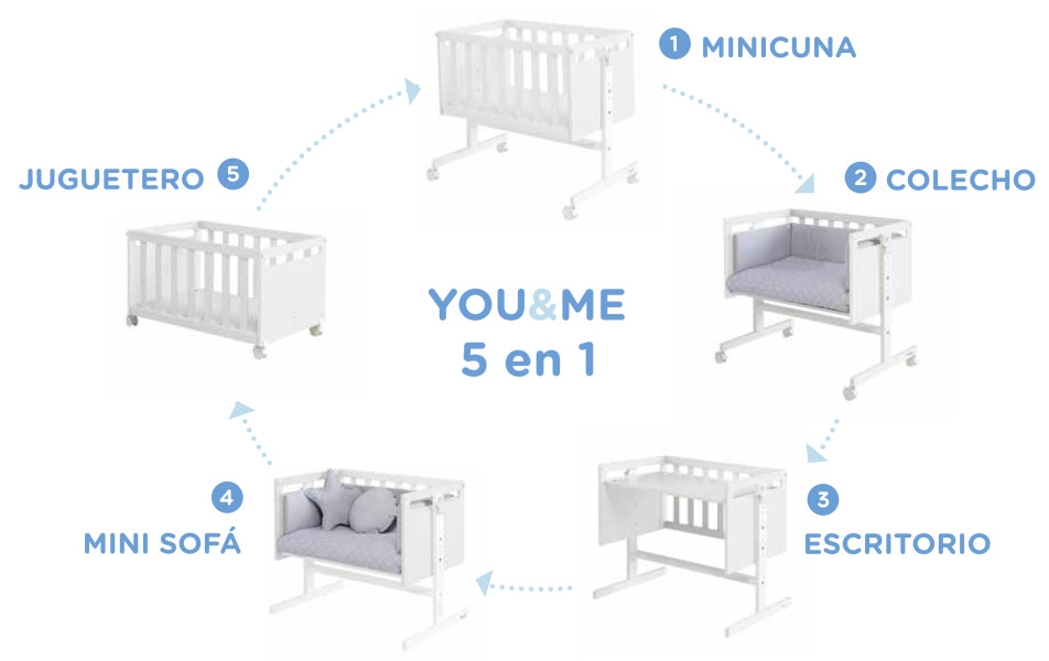 La minicuna You&Me de micuna es un único producto con 5 funcionalidades: Minicuna, minicuna colecho, juguetero, escritorio y sofá: