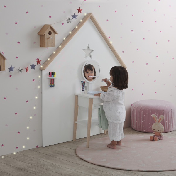 En nuestra colección Micussori podrás encontrar este adorable lavabo ajustable a la altura del niño que además, de una forma muy sencilla, podrá convertirse en tocador o mesa auxiliar.
