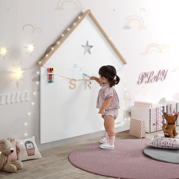 Sin embargo, su principal función es la de protector de pared para que los más pequeños puedan expresarse libremente con sus primeros dibujos gracias a los rotuladores de tiza líquida de fácil limpieza que incluye este panel, además de un soporte de madera para estos. ¡A los más peques les encanta!