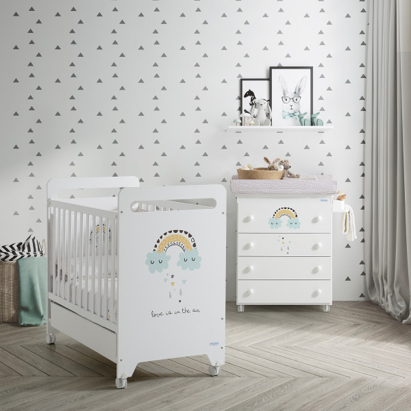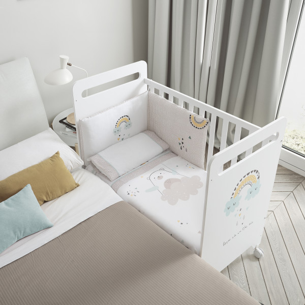 Nino es una de nuestras cunas más divertidas gracias a sus nubes y arcoíris que alegran el día a cualquiera. Ofrece una gran versatilidad gracias a los complementos opcionales que podrán convertirla en colecho, camita, escritorio… y así poder alargar su vida útil y disfrutarla. Dispone de bañera y textil a juego.