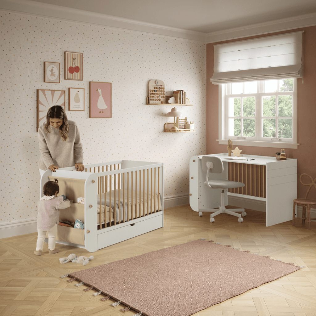 Fabricada con maderas procedentes de bosques sostenibles e inspirada en un estilo natural, Salónica está disponible en un elegante acabado Blanco-Madera, siendo muy versátil y combinable con cualquier estilo de habitación de bebé.