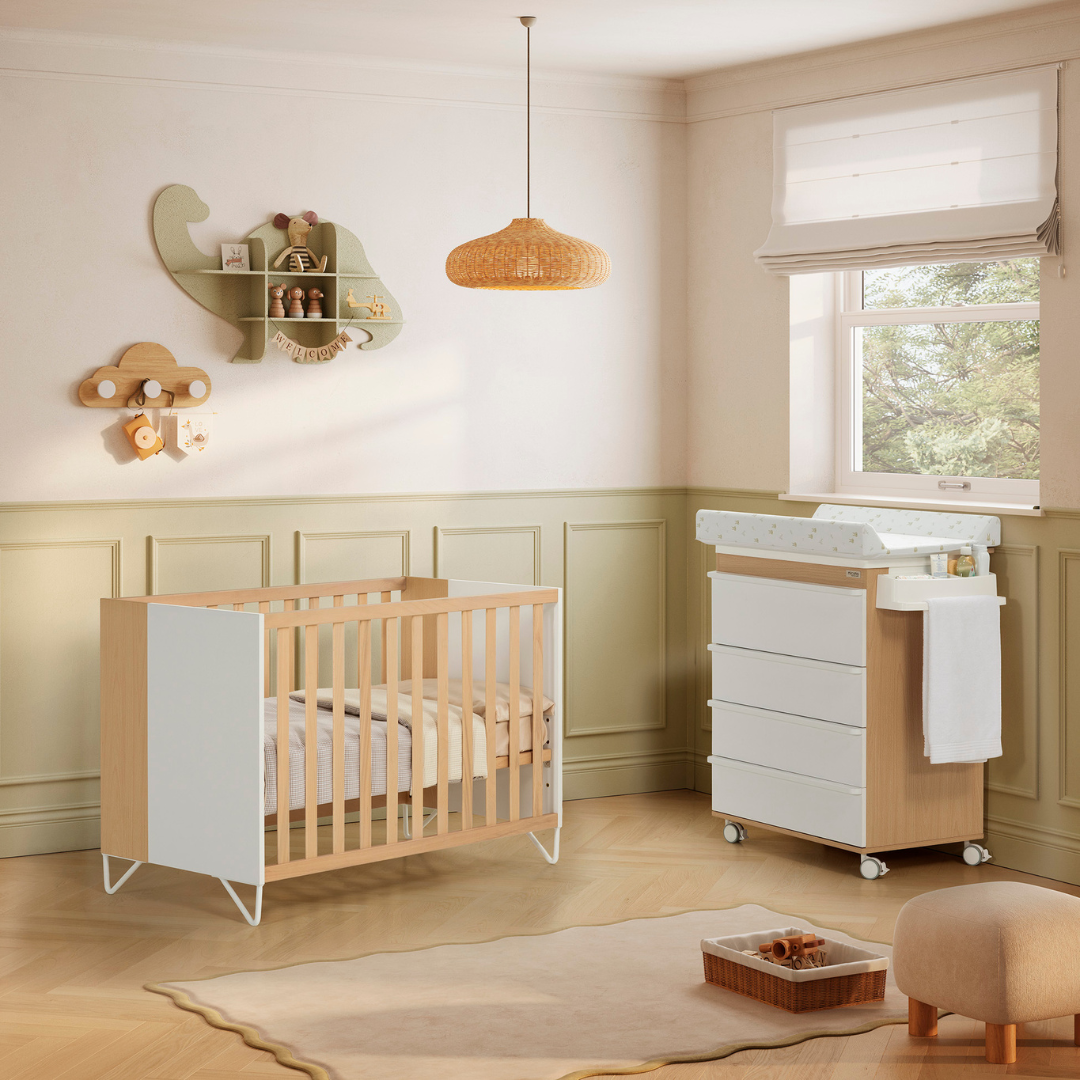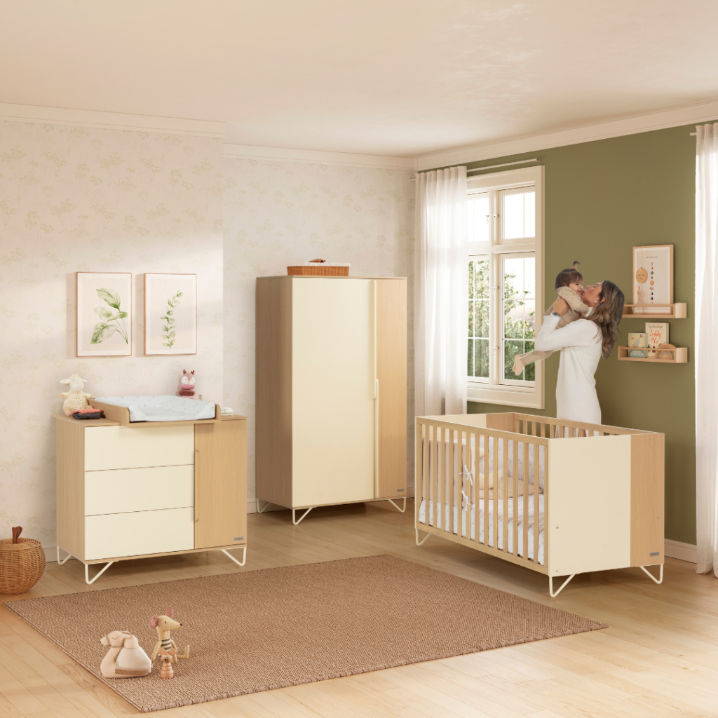 Amaia está compuesta por cuna 120×60, cuna 140×70 convertible en camita, cómoda, bañera y armario. Todo lo necesario para vestir el dormitorio del bebé con coherencia estética y funcionalidad, siguiendo una misma línea de diseño.