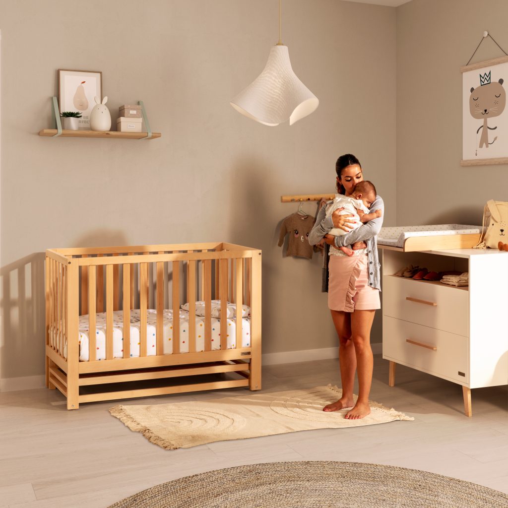 La nueva cuna Mountain acabada en cera natural mantiene el tacto original de la madera de haya, conservando también su tono claro y natural.