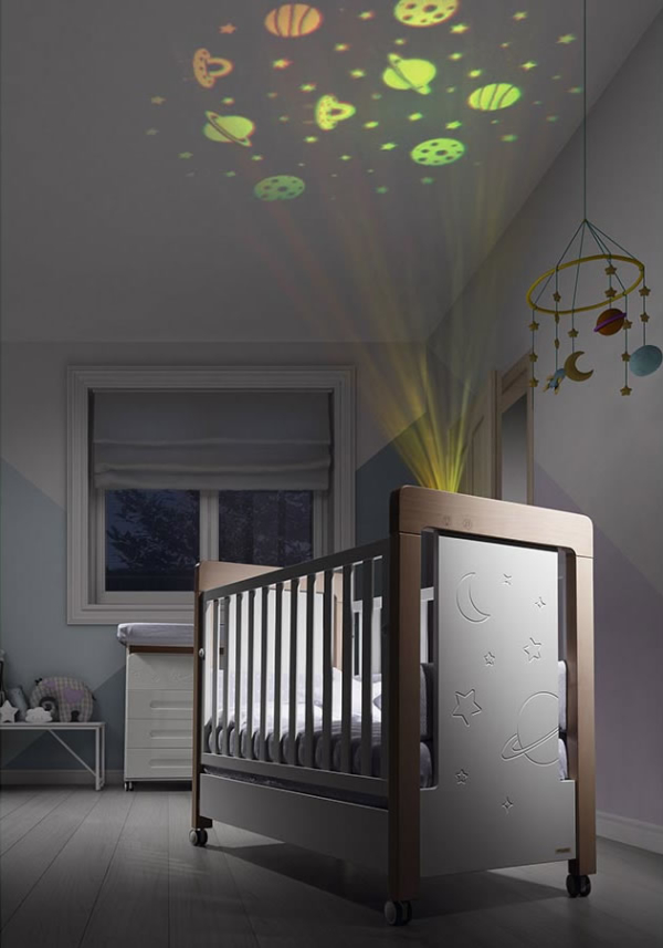 Trae una innovadora tecnología aplicada a la habitación del bebé gracias al panel de control Touch, una botonera digital impresa directamente sobre la madera facilitando el sueño del bebé proyectando en el techo de la habitación una bonita galaxia de relajantes colores o haciendo sonar una dulce nana que lo hará dormir plácidamente.