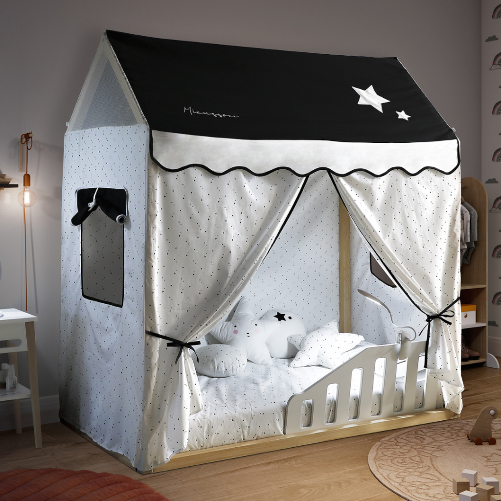 Tipi House con textil Claire, barrera Montessori y lámpara LED En él podrá verse reflejado y reconocerse desde bebé. Gracias a su barra, podrá incorporarse y sujetarse en ella para hacer movimientos laterales.