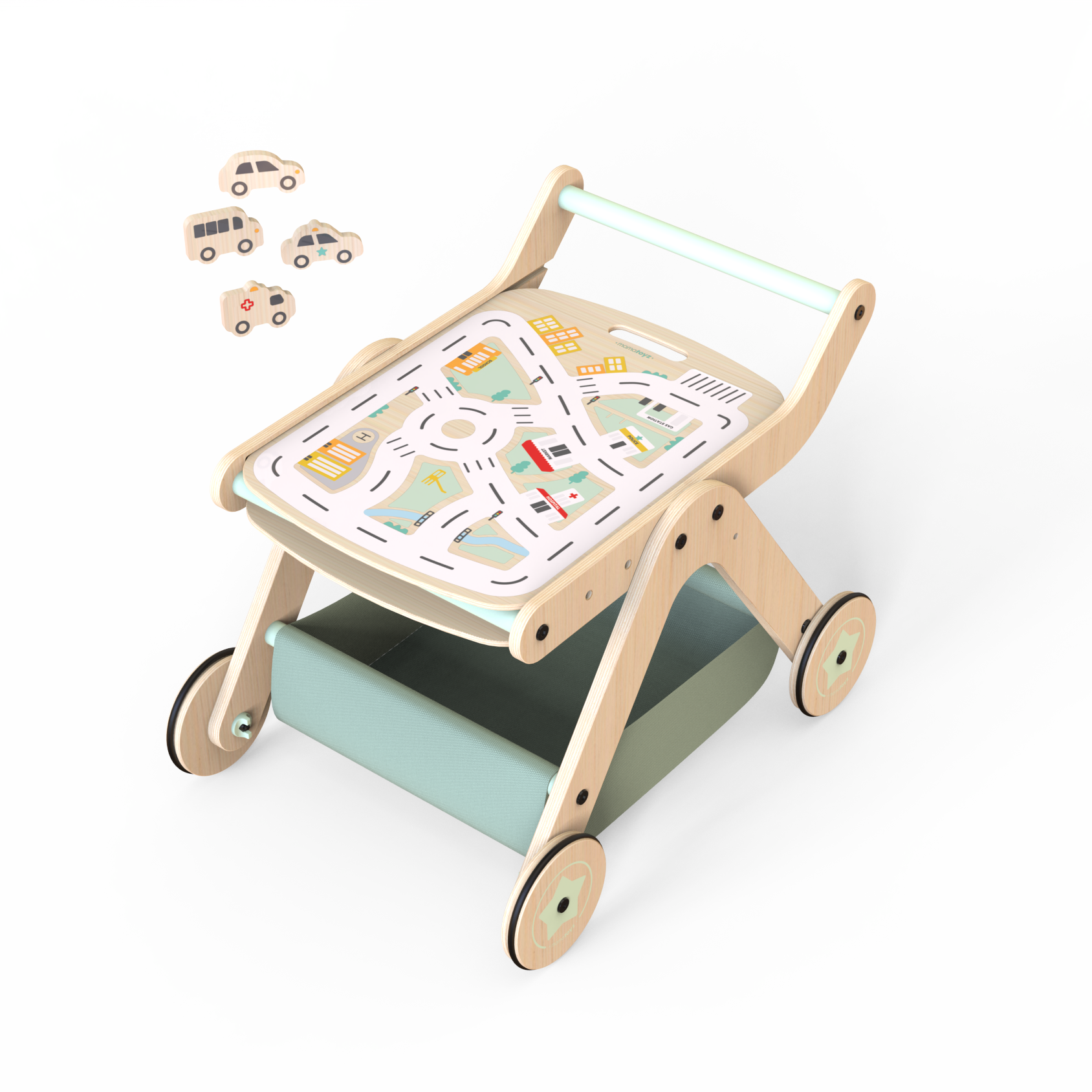 • mesa de actividades, andador, plano de ciudad y carrito de la compra
