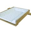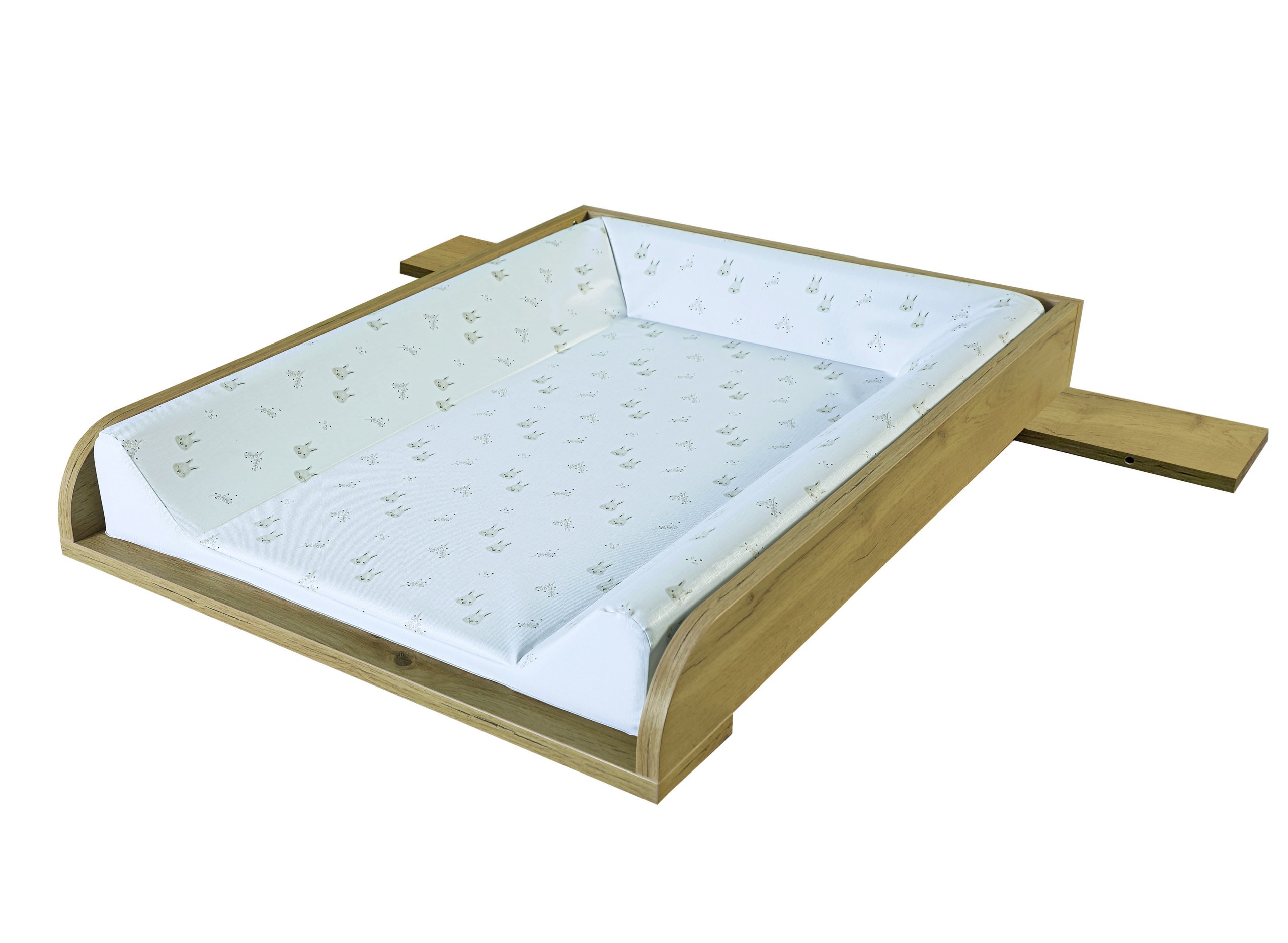 El cambiador con acabado Roble o Acacia incluye tapizado de plástico con estampado Rabbits, anclaje a la pared y sistema antivuelco.