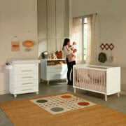 La cuna está realizada con haya y MDF lacado en color blanco y cera natural con acabado antibacteriano y antivírico. Su somier tiene tres posiciones con patas fijas. Esta cuna puede complementarse con el opcional de Cambiador cuna.