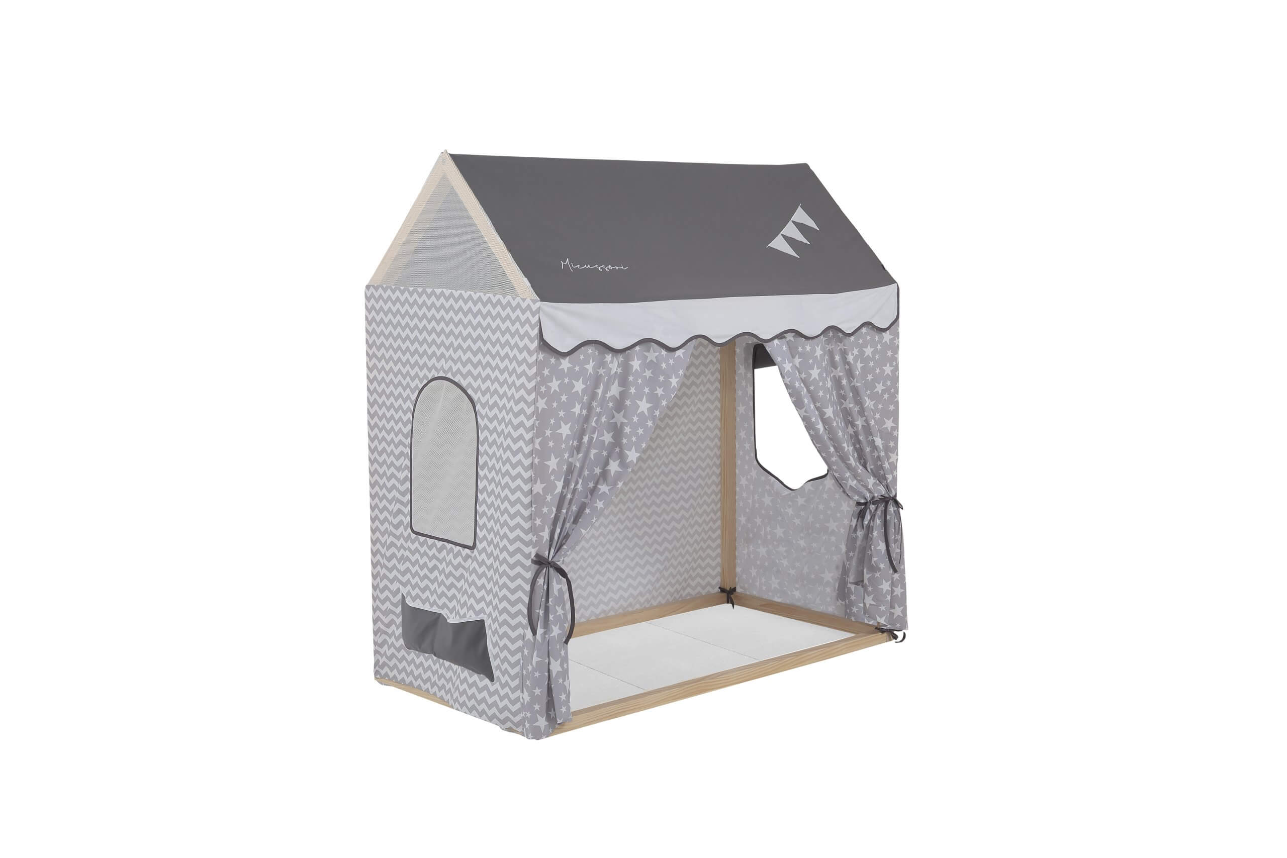 Este complemento textil está diseñado para cubrir toda la estructura de la cama tipo casita, incluyendo el techo y los laterales con detalles que simulan ventanas, transformando la cama en un auténtico refugio con forma de casita.