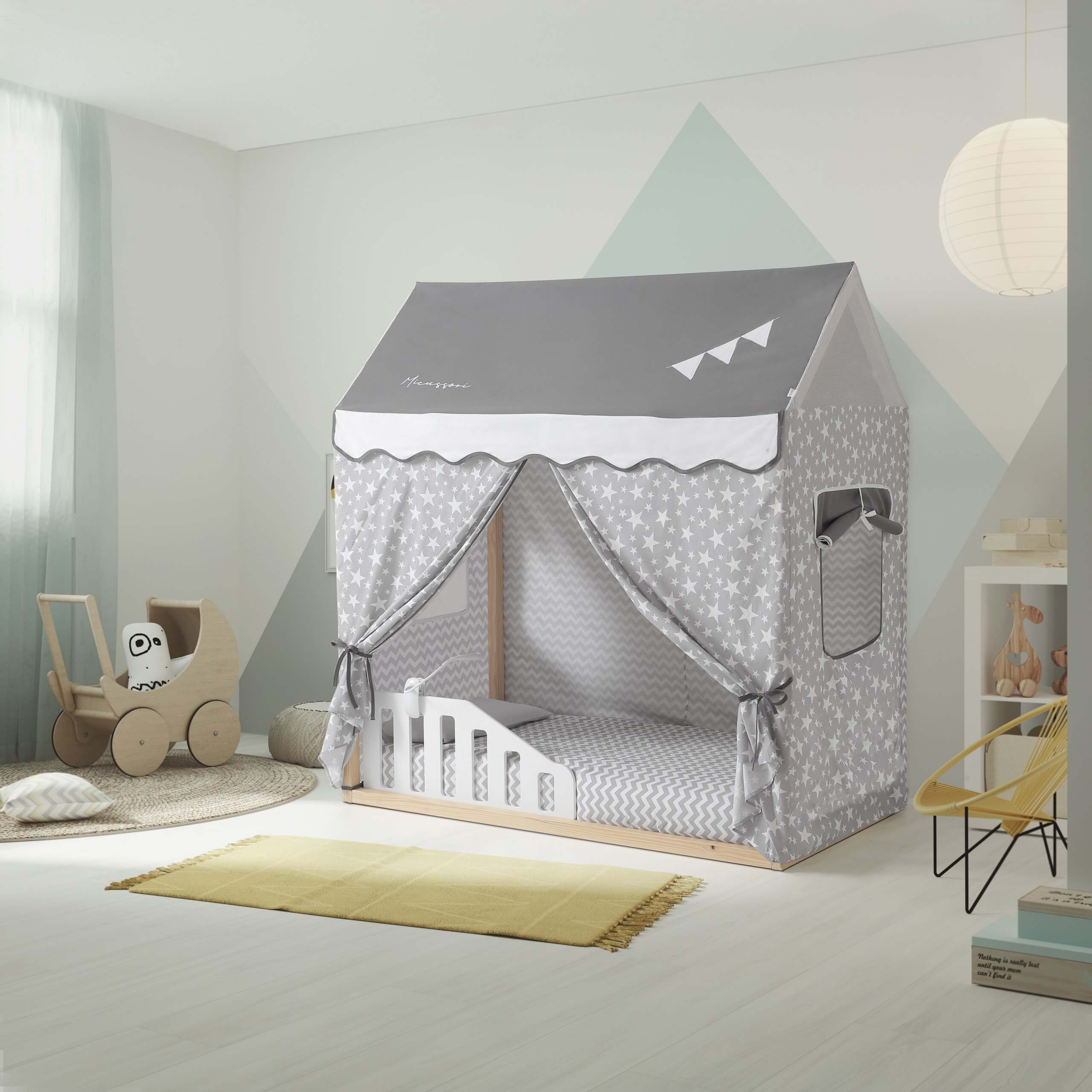 Esta cama tipo casita, inspirada en la metodologÃa Montessori, está pensada para favorecer la autonomÃa del niño desde sus primeros años. Su diseño a ras de suelo permite que el pequeño acceda y salga de la cama con total seguridad y libertad, promoviendo su independencia en el descanso diario.
